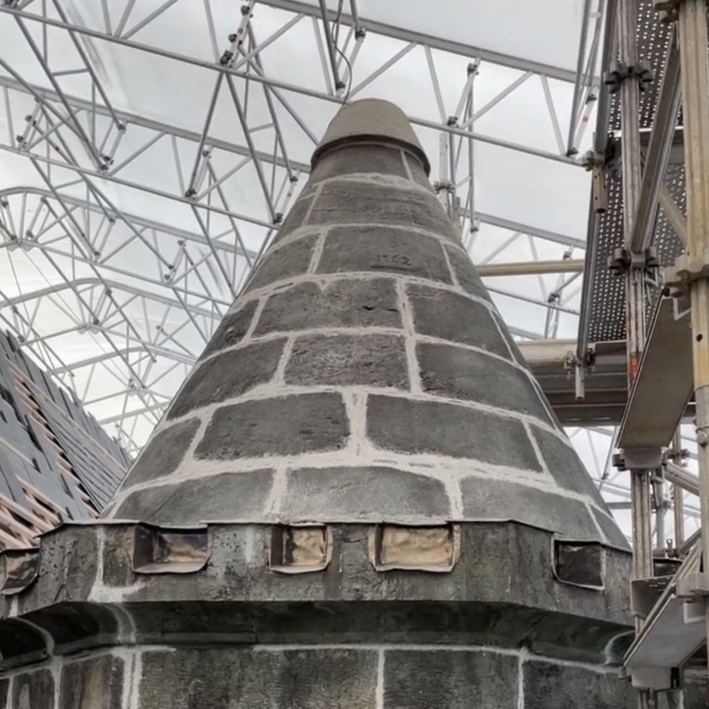 Etter fire år med restaurering av bygningsdeler i kleberstein, avsluttes arbeidet denne høsten, noe forsinket på grunn av utfordringer knyttet til pandemien. Restaurering av pyntedetaljer i kleberstein fortsetter.