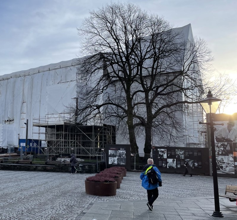 Hele kirken dekkes av presenning, som skåner bygget når taktekkingen skal skiftes. Også de andre arbeidene som pågår utvendig får ly for Stavanger-været.