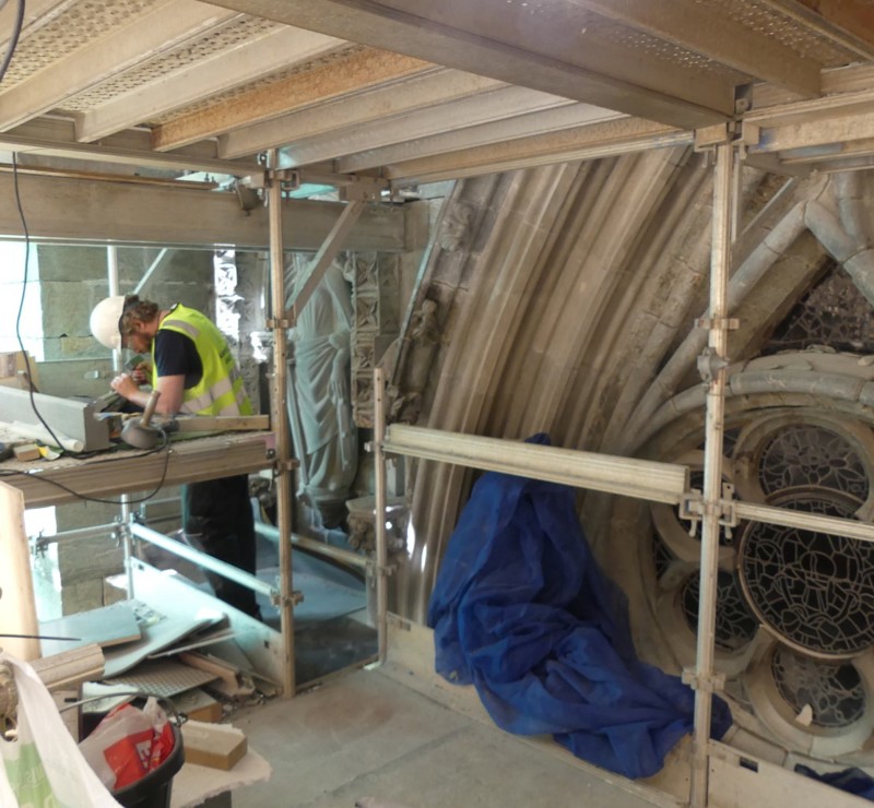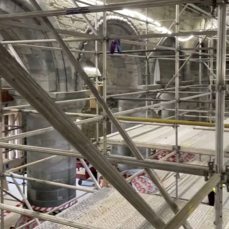 Stillaser langs vegger blir stående der det trengs, blant annet for arbeidene med å restaurere detaljer i kleberstein.