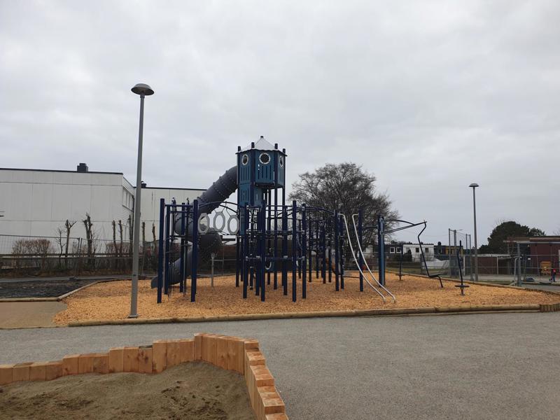 Denne superlekeplassen har utfordrende naturlek som tema og er inspirert av havet i formspråk og fargebruk.