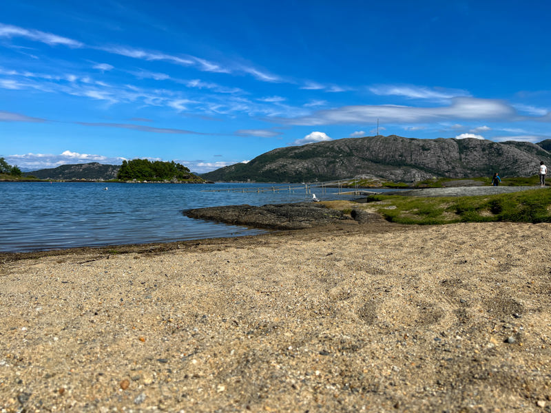 Det er gode gang- og sykkelforbindelser til badeplassen fra turveien langs Gandsfjorden og videre til Hinnastraen.