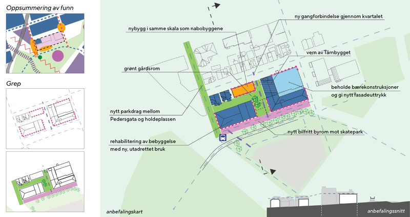 Plangrep skal basere seg på stedsanalyse og anbefalingskart som ble laget i forbindelse med planinitiativet. Hvordan planforslaget forholder seg til anbefalingskartet skal beskrives i dokumentet.