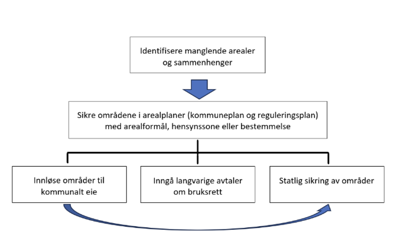 F or å stanse reduksjon og tap av natur- og friluftsområder og sammenhenger er det viktig å sikre grønnstruktur gjennom en juridisk prosess. For at arealet kan disponeres til fri bruk av allmennheten vil det være nødvendig at kommunen eier arealet eller større langvarige avtaler med eieren. Det er ulike metoder for langsiktig sikring av grøntareal. Verktøy som brukes, må tilpasses behovene og mulighetene for hvert enkelt område avhengig av funksjon , nødvendig skjøtsel og andre hensyn i prosessen.