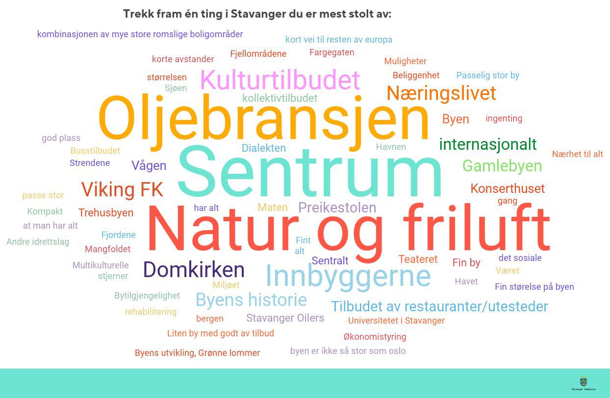 På spørsmål om hva vi er mest stolte av svarer flertallet nettopp sentrum. Deretter kommer naturen/friluftstilbudet og så oljebransjen på en tredjeplass. Mange trekker fram innbyggerne, kulturtilbudet og domkirken som noe de er stolte av. Gamle Stavanger, Preikestolen, Viking og det internasjonale nevnes også flere ganger. 18% svarer vet ikke.