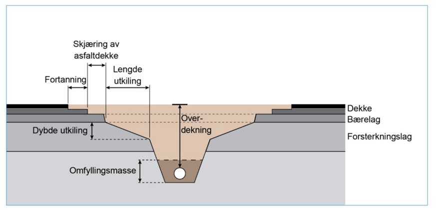 - Overdekning på ledninger skal være 15 cm + asfalt.