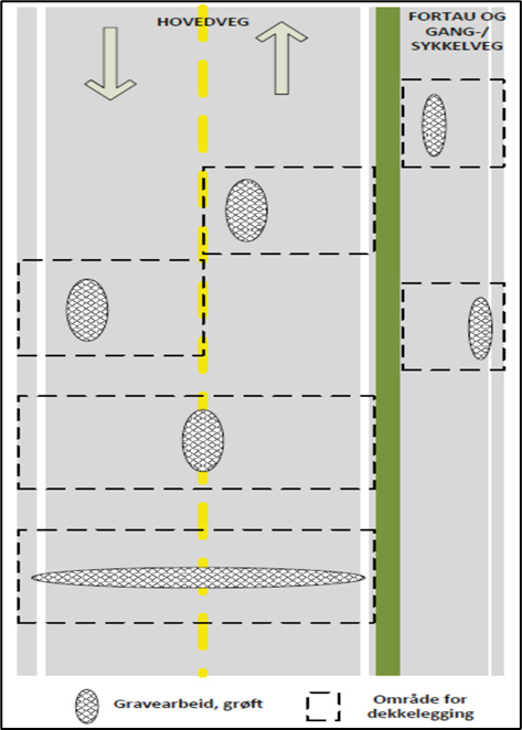 - Når ledningsarbeidet omfatter store konstruksjoner og plasstøpte kummer eller kulverter som påvirker veikonstruksjonen og begrenser tilgangen og framkommeligheten til annen nødvendig infrastruktur på strekningen.