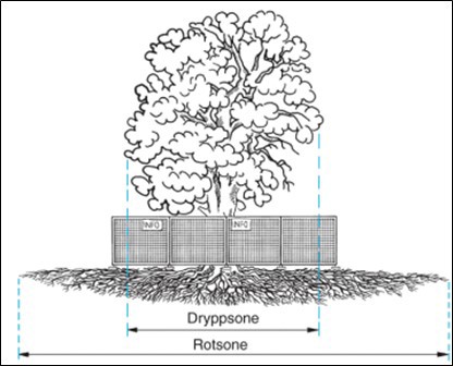 Rotsonen er den underjordiske delen av et tre. Røttene hos parktrær vokser langt utenfor trekronen. Vanlig rotsone hos trær i parker er 2—3 ganger så stor som omfanget av trekronen. |